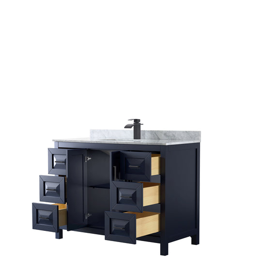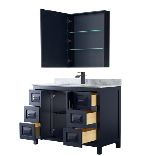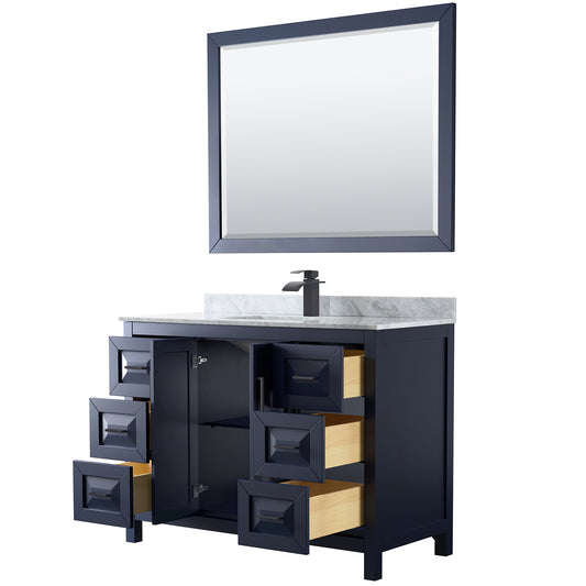 Daria 48" Single Vanity in Dark Blue, Carrara Marble Top, Black Trim, 46" Mirror