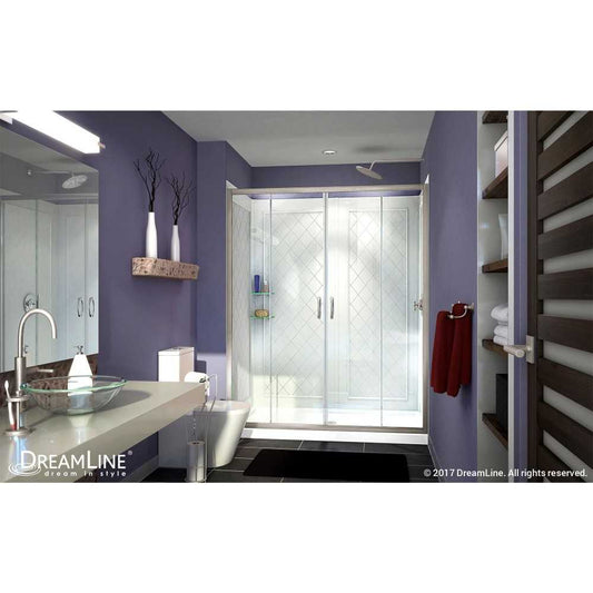 Visions 32 in. D x 60 in. W x 76 3/4 in. H Sliding Shower Door in Brushed Nickel with Center Drain White Base, Backwalls