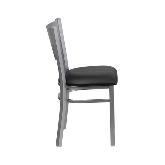 Silver Slat Back Metal Restaurant Chair - Black Vinyl Seat