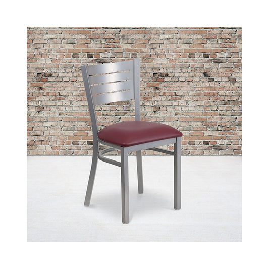 Silver Slat Back Metal Restaurant Chair - Burgundy Vinyl Seat