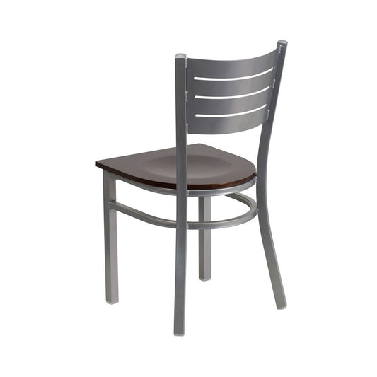 Silver Slat Back Metal Restaurant Chair - Walnut Wood Seat