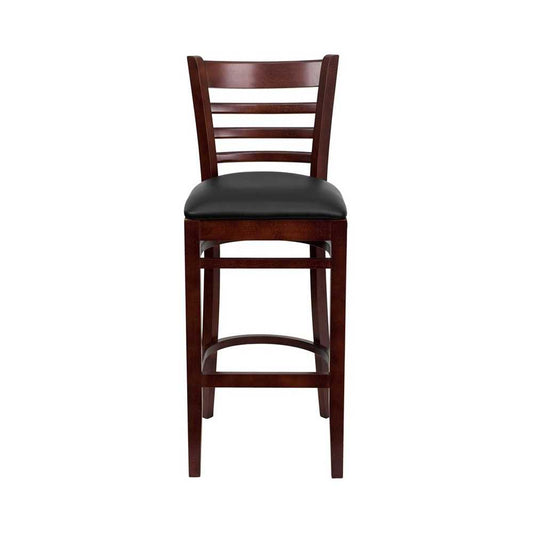 Ladder Back Mahogany Wood Restaurant Barstool - Black Vinyl Seat