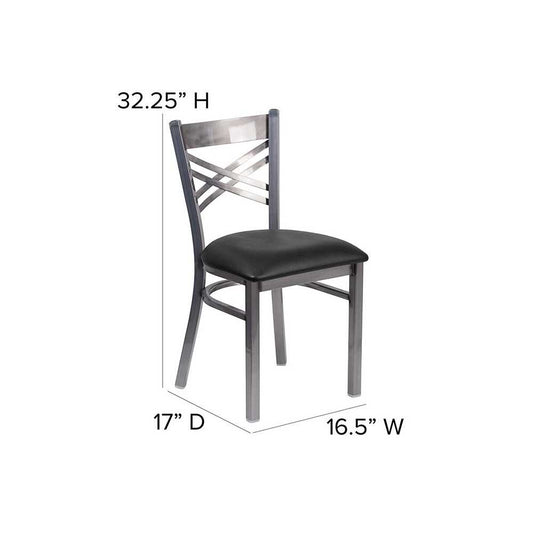 Clear Coated ''X'' Back Metal Restaurant Chair - Black Vinyl Seat