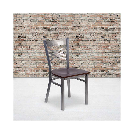 Clear Coated ''X'' Back Metal Restaurant Chair - Walnut Wood Seat