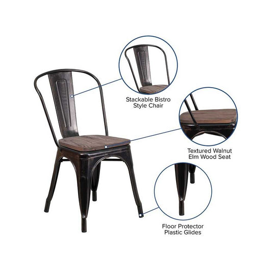 Black-Antique Gold Metal Stackable Chair with Wood Seat