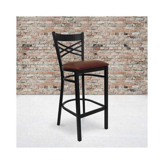 Black ''X'' Back Metal Restaurant Barstool - Burgundy Vinyl Seat