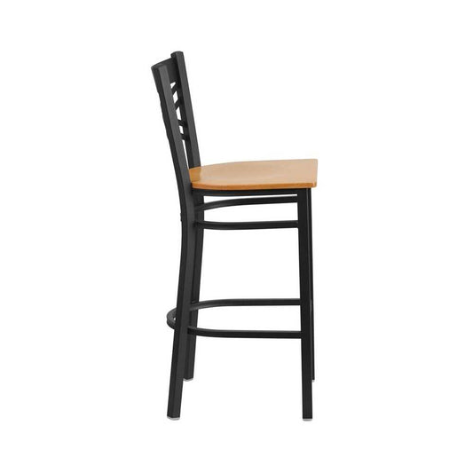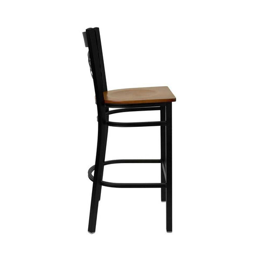 Black ''X'' Back Metal Restaurant Barstool - Natural Wood Seat