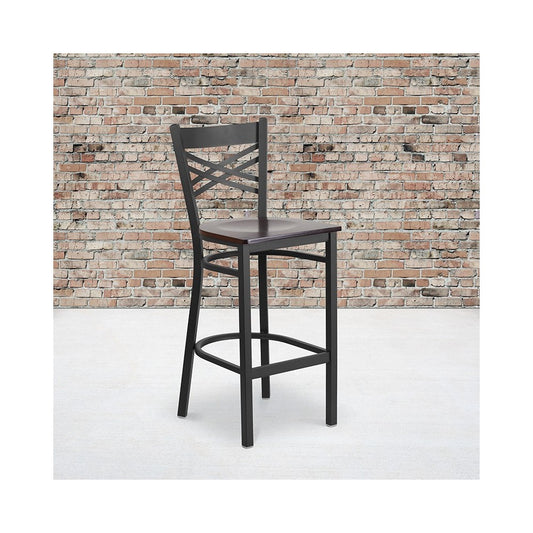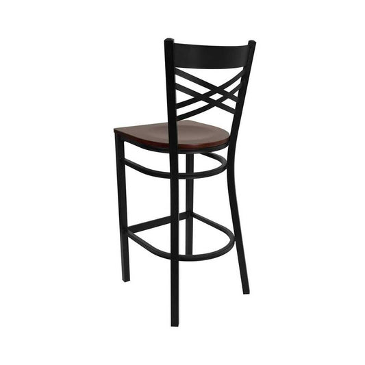 Black ''X'' Back Metal Restaurant Barstool - Mahogany Wood Seat