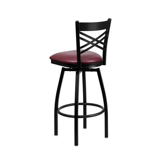 Black ''X'' Back Swivel Metal Barstool - Burgundy Vinyl Seat