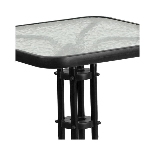 23.5'' Square Glass Metal Table with 2 Black Rattan Stack Chairs