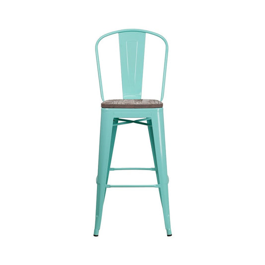 30" High Mint Green Metal Barstool with Back and Wood Seat