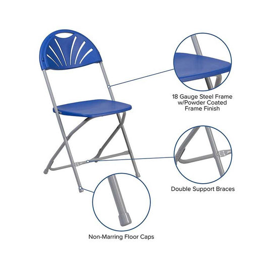 2 Pack 650 lb. Capacity Blue Plastic Fan Back Folding Chair