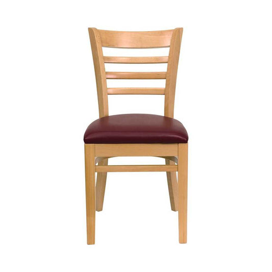 Ladder Back Natural Wood Restaurant Chair - Burgundy Vinyl Seat