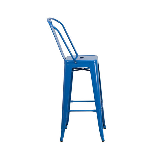 Commercial Grade 30" High Blue Metal Indoor-Outdoor Barstool with Removable Back
