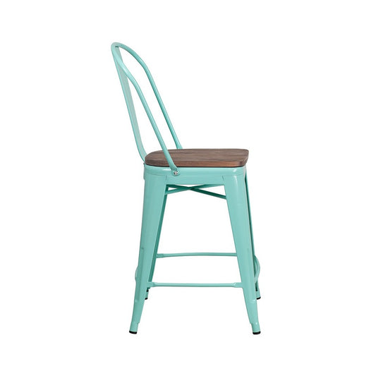 24" High Mint Green Metal Counter Height Stool with Back and Wood Seat