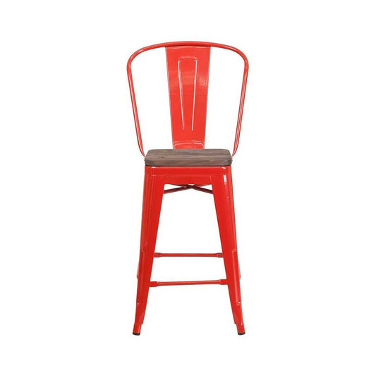 24" High Red Metal Counter Height Stool with Back and Wood Seat
