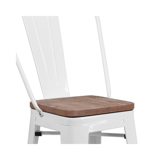 24" High White Metal Counter Height Stool with Back and Wood Seat