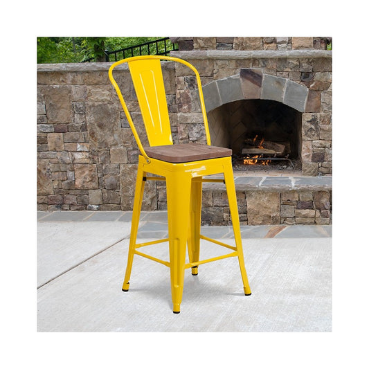 24" High Yellow Metal Counter Height Stool with Back and Wood Seat