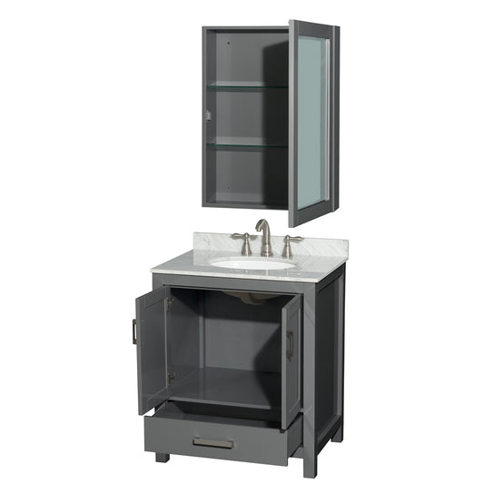 Sheffield 30 inch Single Bathroom Vanity in Dark Gray, White Carrara Marble Countertop, Undermount Oval Sink, and Medicine Cabinet