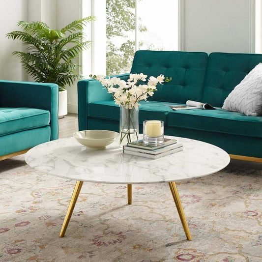 Lippa 40" Round Artificial Marble Coffee Table with Tripod Base, Gold White
