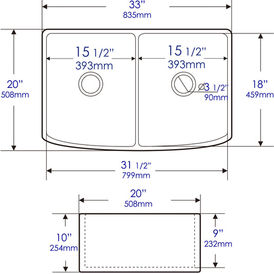 ALFI Brand Smooth Curved 33" x 20" Double Bowl Fireclay Farm Sink with Grid