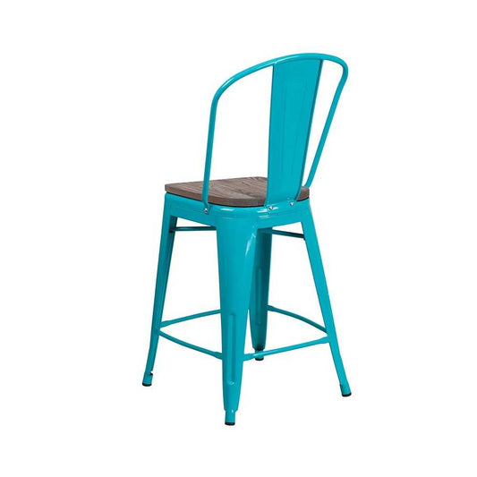 24" High Crystal Teal-Blue Metal Counter Height Stool with Back and Wood Seat