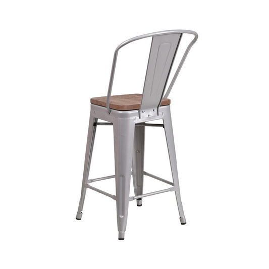 24" High Silver Metal Counter Height Stool with Back and Wood Seat