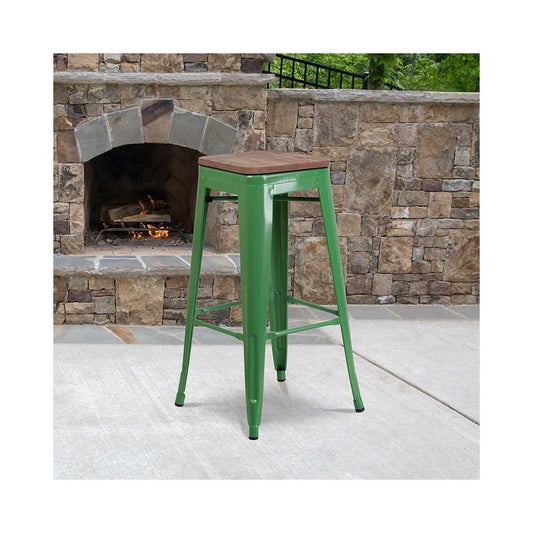 30" High Backless Green Metal Barstool with Square Wood Seat