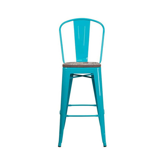 30" High Crystal Teal-Blue Metal Barstool with Back and Wood Seat