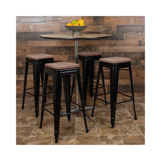 30" High Metal Indoor Bar Stool with Wood Seat in Black - Stackable Set of 4