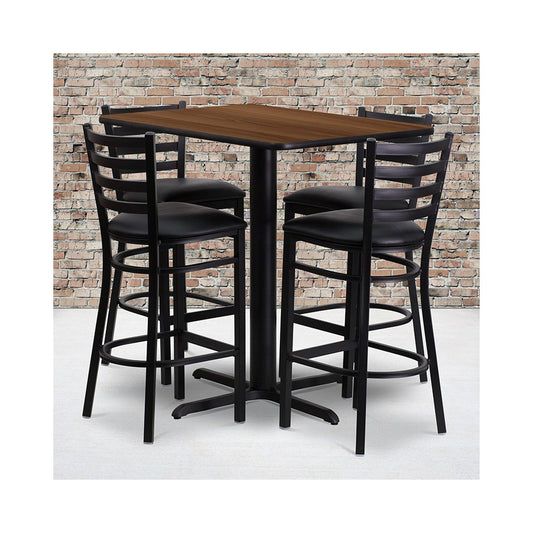 24''W x 42''L Rectangular Walnut Laminate Table Set with 4 Ladder Back Metal Barstools - Black Vinyl Seat