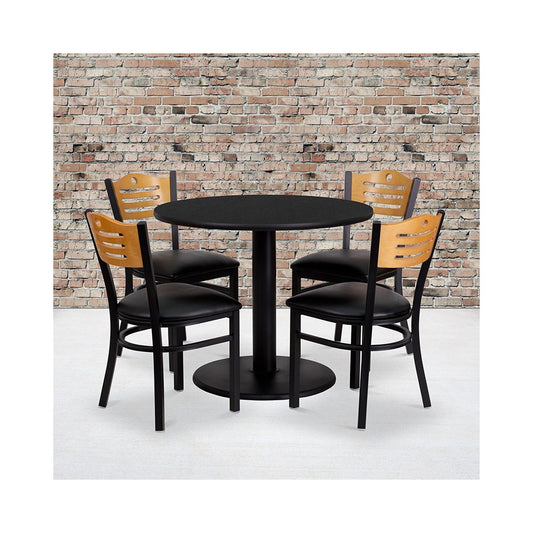 36'' Round Black Laminate Table Set with 4 Wood Slat Back Metal Chairs - Black Vinyl Seat
