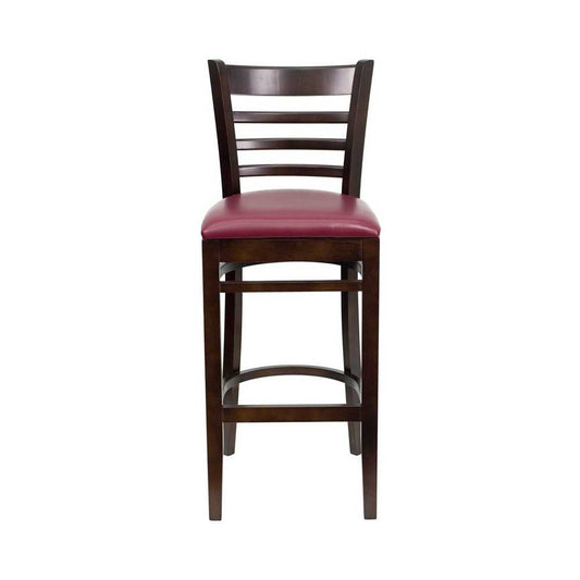 Ladder Back Walnut Wood Restaurant Barstool - Burgundy Vinyl Seat