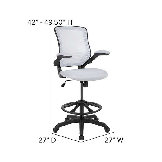 Mid-Back White Mesh Ergonomic Drafting Chair with Adjustable Foot Ring and Flip-Up Arms