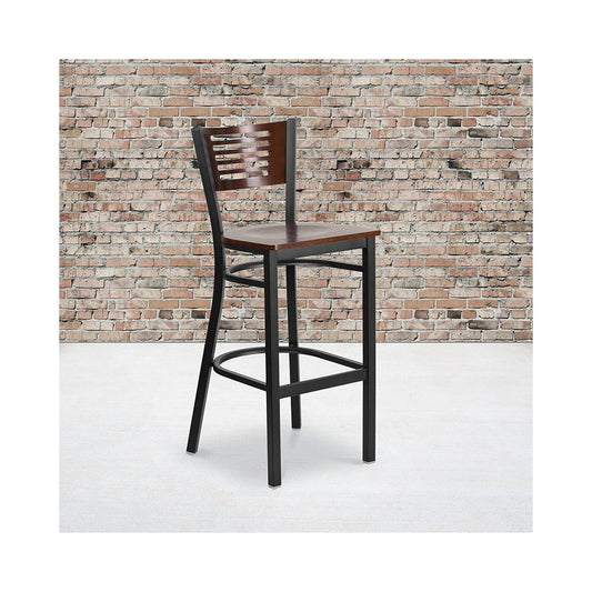 Black Slat Back Metal Restaurant Barstool - Walnut Wood Back & Seat
