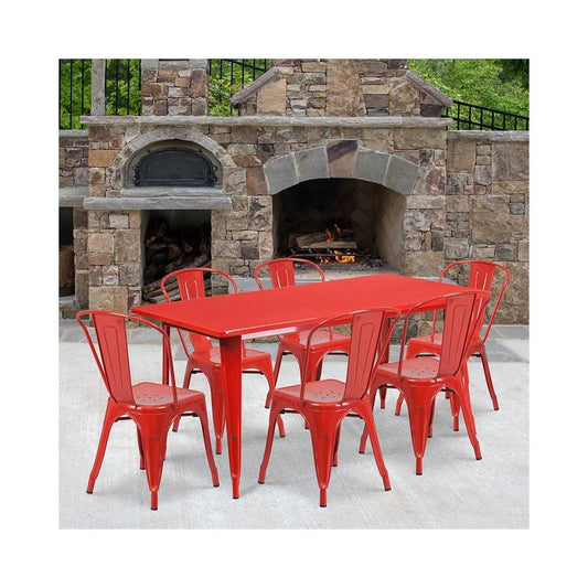 Commercial Grade 31.5" x 63" Rectangular Red Metal Indoor-Outdoor Table Set with 6 Stack Chairs