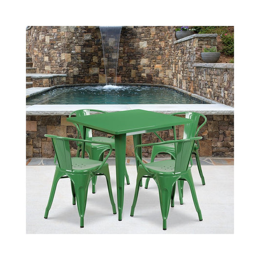 Commercial Grade 31.5" Square Green Metal Indoor-Outdoor Table Set with 4 Arm Chairs