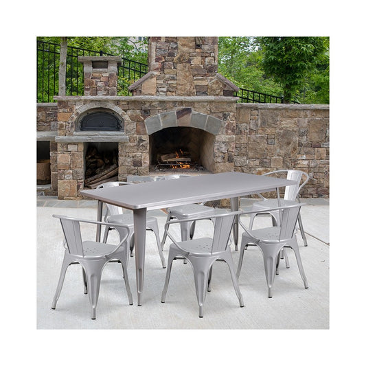 Commercial Grade 31.5" x 63" Rectangular Silver Metal Indoor-Outdoor Table Set with 6 Arm Chairs