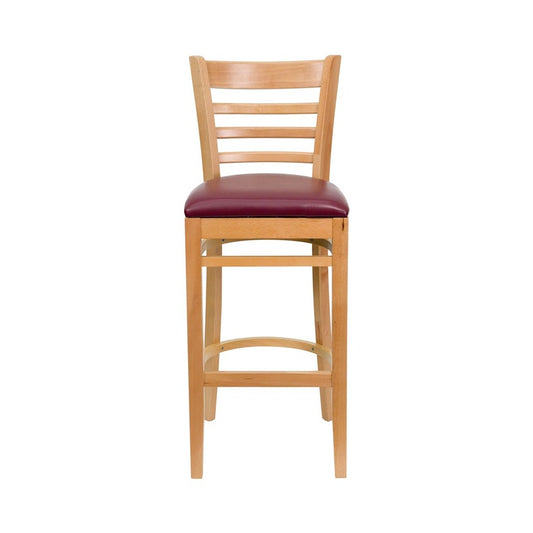 Ladder Back Natural Wood Restaurant Barstool - Burgundy Vinyl Seat