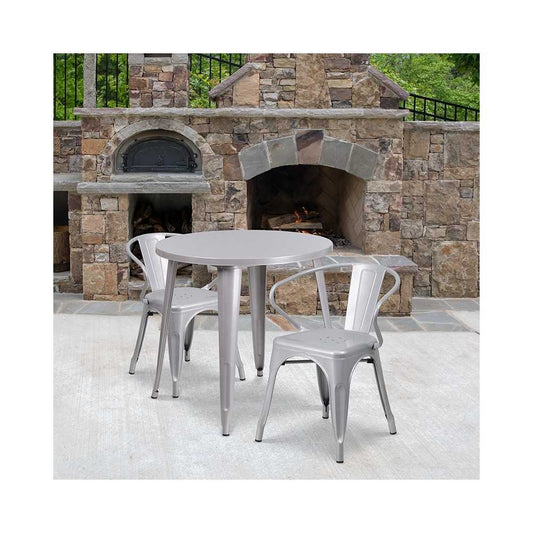 Commercial Grade 30" Round Silver Metal Indoor-Outdoor Table Set with 2 Arm Chairs