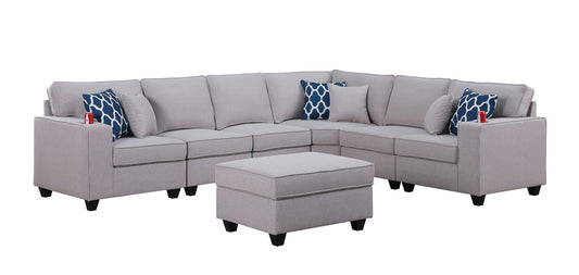 Cassia Light Gray Linen 7 Seat Reversible Modular Sectional Sofa with Ottoman