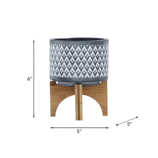 Ceramic 5" Aztec Planter On Wooden Stand, Gray