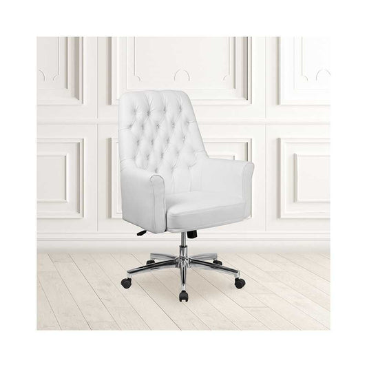 Mid-Back Traditional Tufted White LeatherSoft Executive Swivel Office Chair with Arms