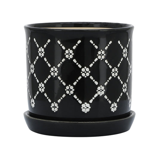 S/2 6/8" Chained Daisies Planter W/ Saucer, Black