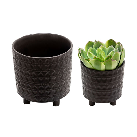 S/2 Footed Planters 9/6", Hearts, Matt Black