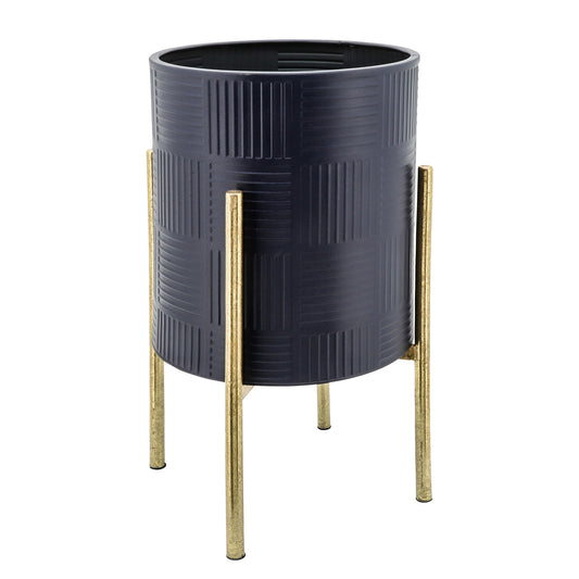 S/2 Textured Planter On Metal Stand, Navy/gld