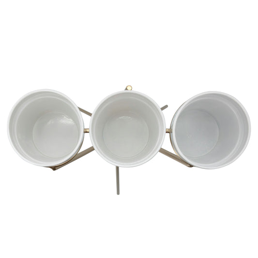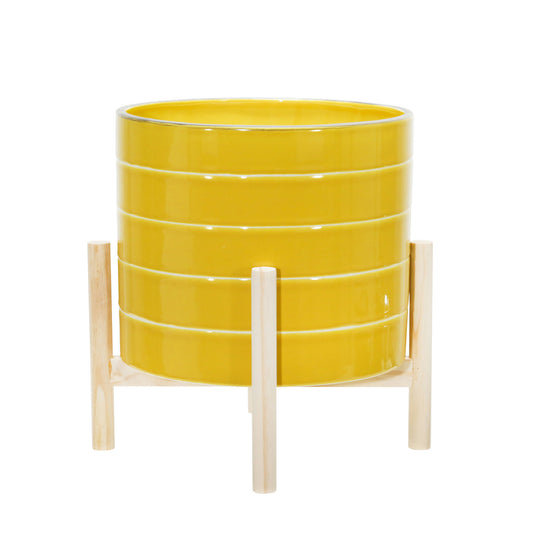 12" Ceramic Striped Planter W/ Wood Stand, Yellow