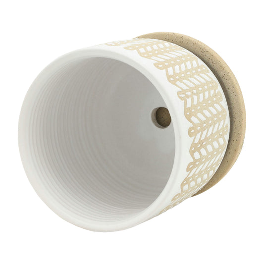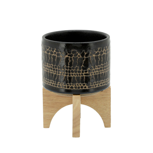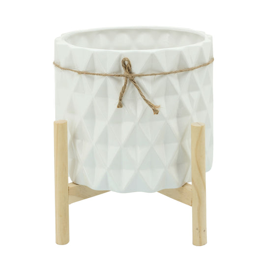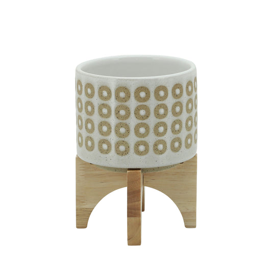 12" Ceramic Tribal Planter W/ Wood Stand, Beige