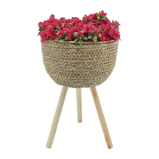 12" Ceramic Planter W/ Wood Stand, Green Mix
