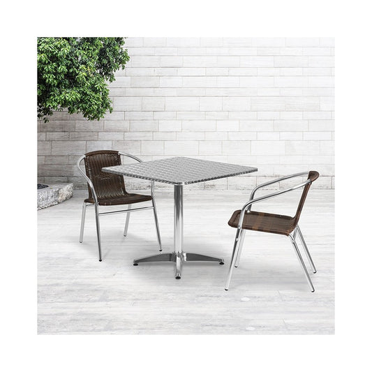 31.5'' Square Aluminum Indoor-Outdoor Table Set with 2 Dark Brown Rattan Chairs